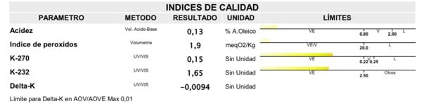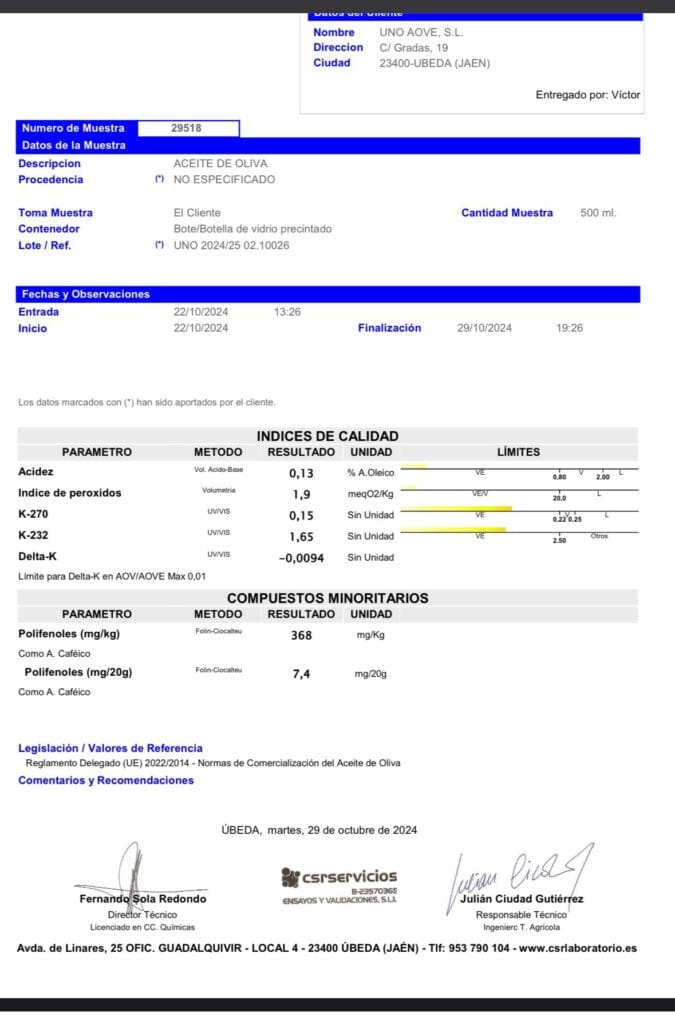 Los encargados de realizar un exhaustivo análisis químico de nuestra cosecha 2024/25 fue el laboratorio CSR de Úbeda (Jaén). Una grata sorpresa el ver unos excelentes resultados en los valores obtenidos, que se van superando año tras año.